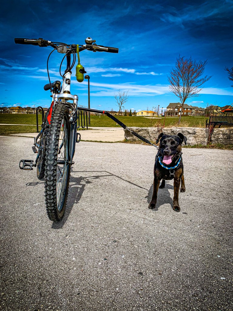 We’ve taught a few dogs over the years how to run with the bike and each one is a bit different. Some are slower, some like to keep pace with the bike and one is a maniac that when given the cue GO will turn on the rockets and drag the bike.